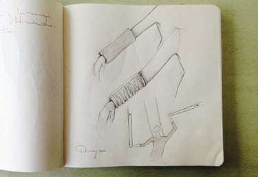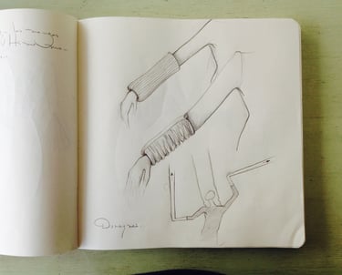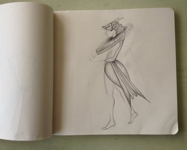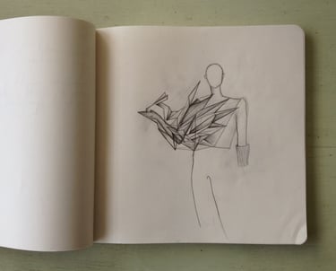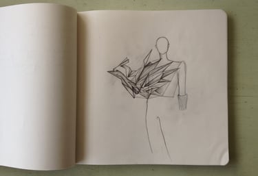 Los primeros bocetos, apenas trazos a lápiz, propusieron la lógica de plegado y transformación que estructuraría toda la visualidad del montaje. En ellos se estudiaron los movimientos, resistencias y tiempos del material, privilegiando la sencillez constructiva y la expresividad del gesto manual. A medida que avanzó el proceso, los dibujos se mantuvieron deliberadamente austeros, permitiendo que el diseño se complete en el cuerpo y en la práctica, más que en la representación bidimensional.